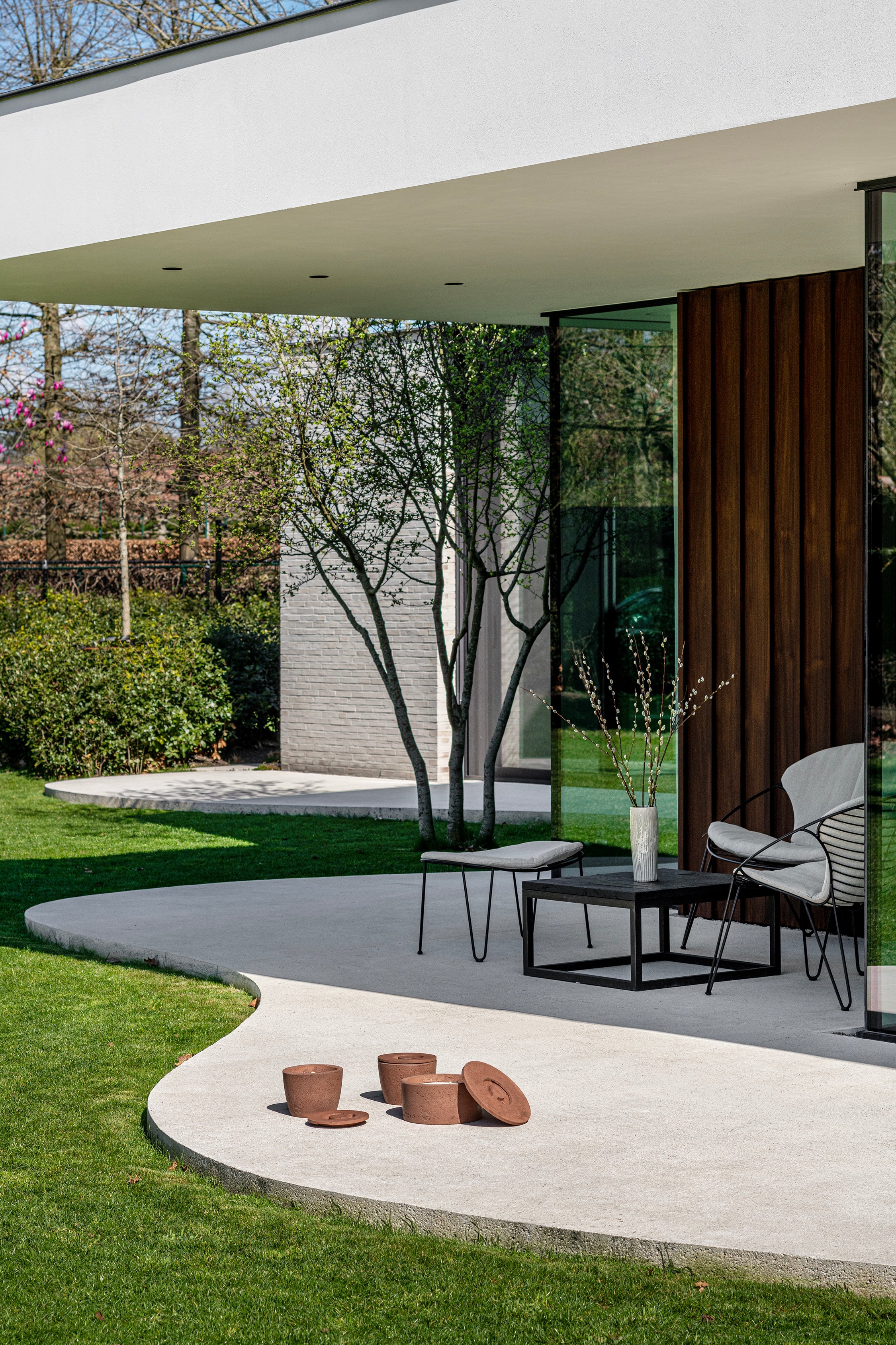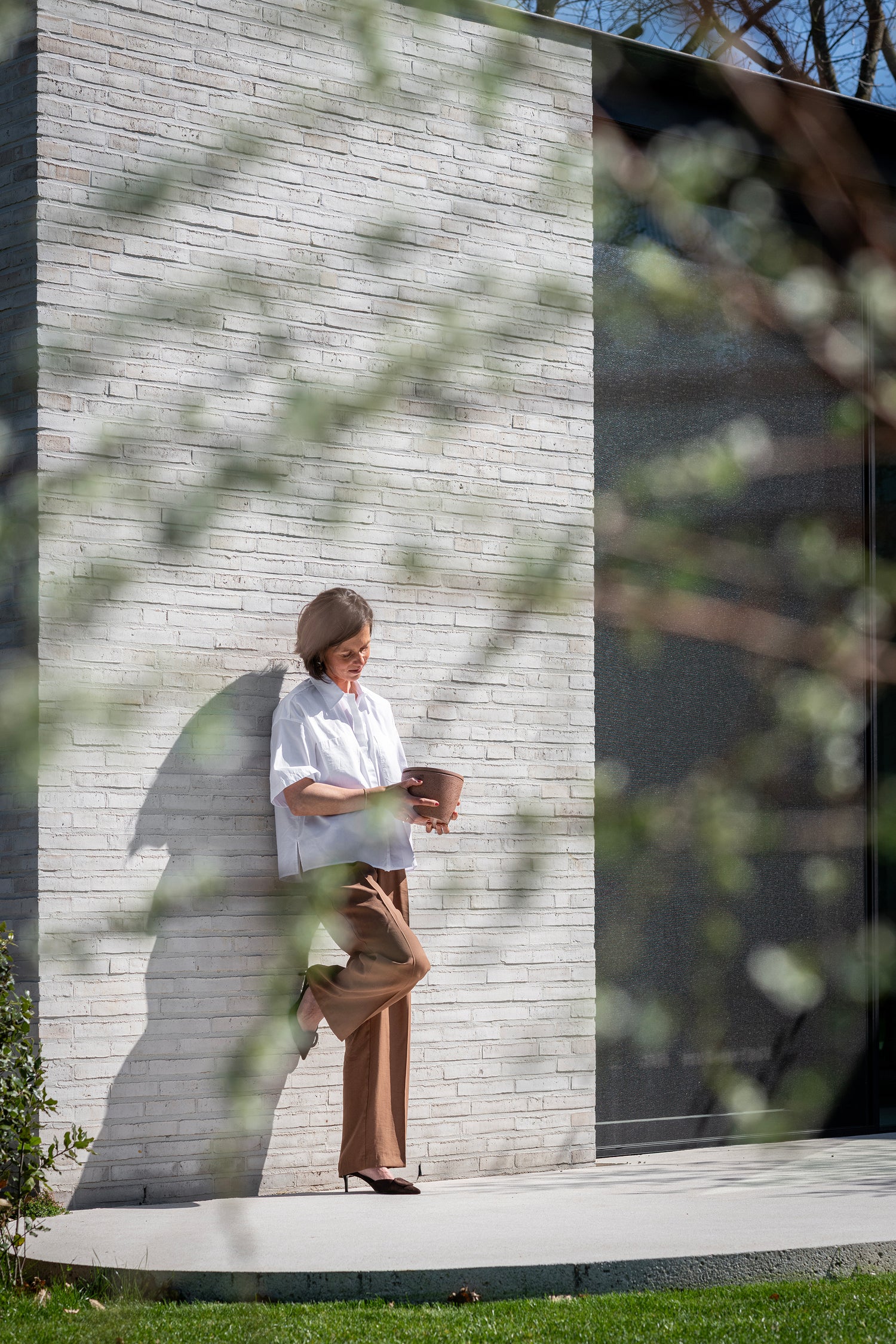 De handgemaakte betonnen houders, met hun stevige deksels en aardse, roodbruine tinten...